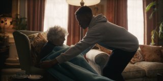 footballer, J.J. (Alistair Nwachukwu), who rings her doorbell one afternoon thinking his ball is in her garden (we'll see it much later suspended in a vine). The central story is a flashback sprung from the frame narrative of the reading of Dorothy Woodley's (Margolyes) will by Dickie (Stephen Fry) to her grandson Scott (Oscar Lloyd) and J.J., the former, a suited snob, constantly demanding to know why the latter is present. The flashback introduces us to a wealthy arts patron struggling to open a can of prunes when her doorbell rings. She asks unusual questions of the handsome young man, then invites him in to help her open that can and when she finds him checking out her extensive library, has him read from Matthew López's LGBTQ+ play 'The Inheritance,' her radar having surmised something about him. He learns she supports the theater and is the Dorothy of 'Friends of Dorothy,' while she finds a budding actor to encourage and the friendship blossoms quickly and deeply, J.J. visiting daily. Margolyes may as well be playing herself, her delightful frankness amusing, while Nwachukwu impresses in what may provide a breakthrough. Knight gives us a slight twist on the expected ending. It's a charmer. B