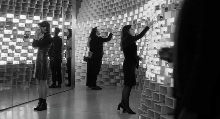 Last year's short animation nominee from France, "Yuck!," was about children recoiling from witnessing people kissing at a campground until two of them discover just what all the fuss is about. This year, Natalie Musteata and Alexandre Singh's "Two People Exchanging Saliva" is a black and white French sci-fi film about a society so averse to kissing, those caught are put into a coffin and thrown into a pit. This nominee has an intriguing build, beginning with one of those coffins, a woman's muffled cries coming from inside, being thrown over a cliff, then slowly revealing just what is going on. Chapter 1 introduces us to Malaise ("Portrait of a Lady on Fire's" Luàna Bajrami), a pretty young woman about to turn twenty-five on her first day at a job in a department store. Employees gather in lines outside, blowing into the face of a security guard before entering. When we see Malaise serving champagne in the interior entrance, we at first surmise she was being tested for alcohol, but when she arrives back at her apartment, a horrified elderly neighbor tells her two teenagers were 'swapping spit' in the stairwell, then offers her garlic gum. In Chapter 2, Malaise puts supervisor Pétulante's (Aurélie Boquien) nose out of joint when her best customer, Angine (Zar Amir Ebrahimi, "Holy Spider"), switches her patronage to Malaise, who has a knack for choosing just the right things for the elegant client. As the two women grow closer, Pétulante grows more suspicious, especially after hearing Malaise clandestinely brushing her teeth in the ladies room. Chapter 3 reveals the dual heartbreak surrounding Malaise's 25th birthday. This odd imagining of a futuristic society features consumers sporting bruised cheeks, goods paid for by an escalating number of slaps to the face and features arresting production design, a violin score and narration by Vicky Krieps. This is my pick to win in a difficult-to-predict category. B+