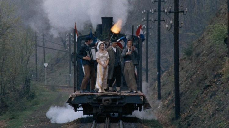Godina's style is notable from opening frames, a centered shot in blocky Academy ratio of Adem's wedding party on an approaching train's platform. The pretty bride smiles as one of Adem's fellow miners fires off a shotgun and men run down to jump aboard bearing gifts of lavishly decorated tree branches and hunted rabbits. The train passes beneath a tunnel emblazoned with a portrait of Stalin and when it emerges, the brides face is smeared with soot. When they gather to celebrate at Adem's house, Godina's composition resembles naive folk art.
